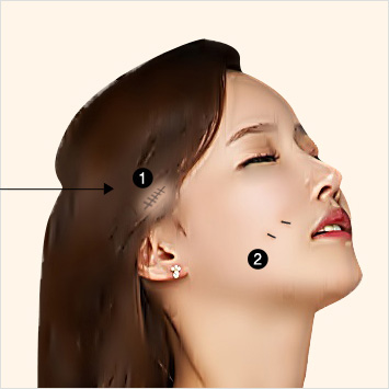 귀 위 머리 안쪽 약 1.5~2cm정도의 절개가 필요하지만 붓기를 최소화하였고 머리로 가릴 수 있어