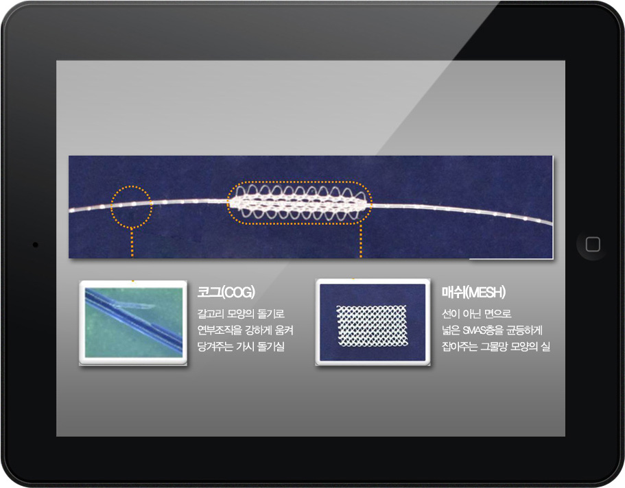 양방향 돌기의 cog는 처진 연부조직을 강력하게 잡아주어 심술보, 입가 주변, 처진 턱 라인을 교정해주게 되며