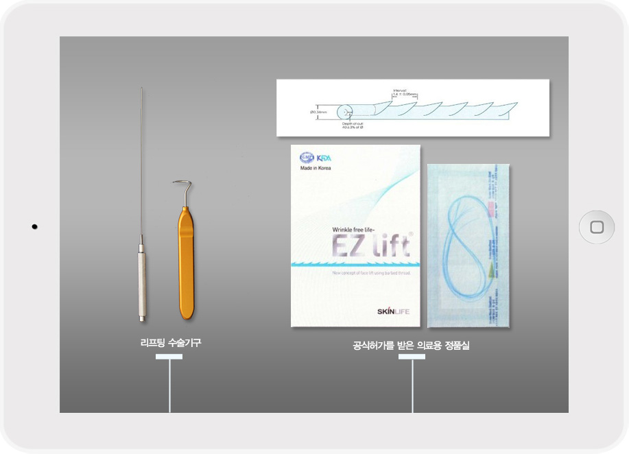 이지리프팅(EZ-Lifting)은 돌기가 있는 cog실을 이용하여 피부를 원래 위치로 올려주는 시술법입니다.