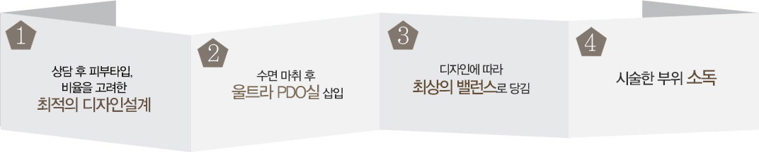 식약청 4등급의 특수한 돌기가 있는 녹는실(PDO)를 이용하여 피부 속에서 천천히 스며들어 시간이 지날 수록 만족감을 느낄 수 있는 시술입니다.