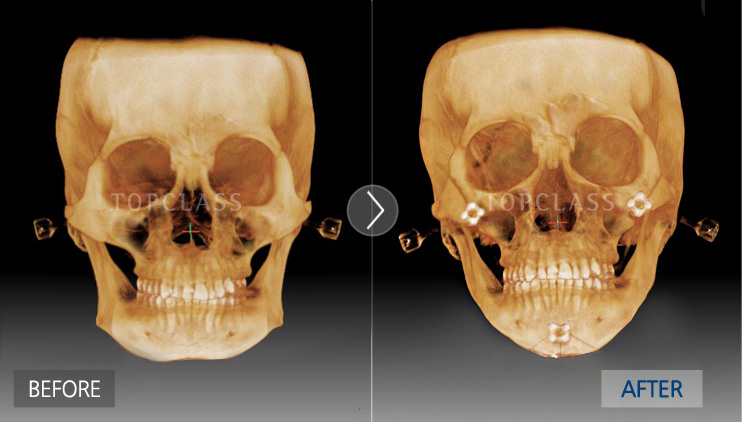 단순히 얼굴 양 옆의 각진 턱(하악각)만 제거하는 단순 사각턱 축소술이 아니라 턱끝 중심을 탑클래스만의