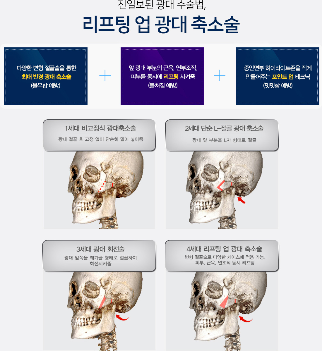 절골방식 변형 사다리꼴, 복합 L 절골술, 광대 회전술 등 다양한 절골 방식 적용