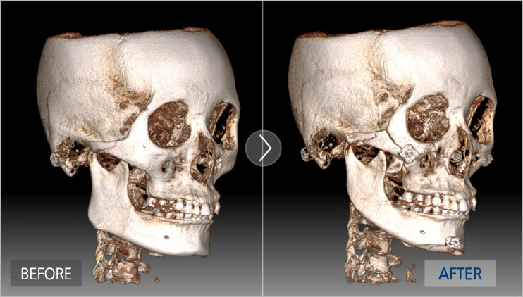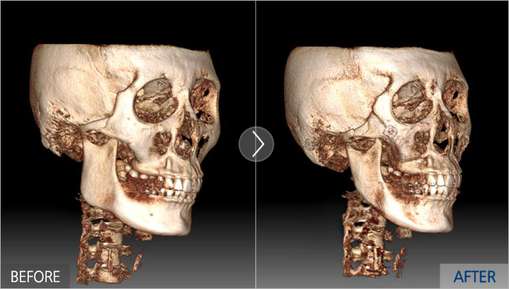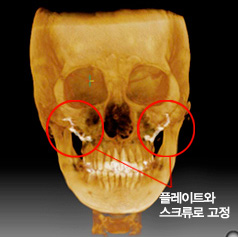 최대 반경으로 광대뼈를 회전시킨 후 절골면을 최대한 밀착시키고 플레이트와 스크류로 단단히 고정하여 불유합을 예방해 줍니다.