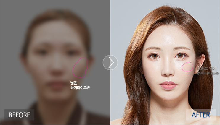 광대뼈를 위, 내측 방향으로 이동시켜 줄 뿐만 아니라 광대뼈 자체의 크기도 줄여주어 작은 하이라이트 존을 만들어 줍니다.