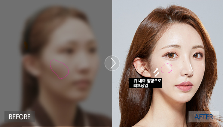 • 4. 리프팅과 포인트 업 테크닉 입체감을 주는 광대 축소를 위해서는 피부, 연부조직 근육을 올려주는 리프팅 테크닉과 앞 광대의 포인트를 만드는 포인트업 테크닉이 필요합니다.