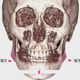 앞턱의 턱뼈를 T자 모양으로 절골하여 제거한 후 다시 위쪽의 뼈도 수평절제 한 후 뼈를 모아 고정하고 양 옆에 고르지 못한 뼈를 제거해주어 매끈하고 갸름한 턱선으로 교정이 가능합니다.